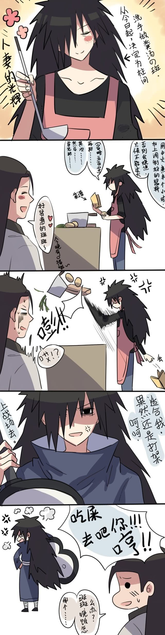 第一个故事是关于斑爷当柱间当贤惠妻子的一天,斑爷化身美丽贤惠娇妻为柱间做饭,习惯打打杀杀的斑爷穿上围裙毫无违和感,斑爷十分努力拿起几百字的菜谱在仔细研读,柱间看了都连忙夸奖斑爷为好贤惠的斑斑,并期待斑爷做出什么的美味的菜肴。但斑爷是谁?宇智波一族的暴躁老祖看到长长的攻略暴脾气马上上来,直接掀翻了厨房并表示只有战斗才适合直接,这吓得柱间在旁边瑟瑟发抖,看来柱间改造斑爷宣告失败。