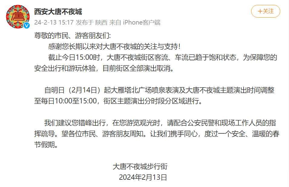 At 3:17 PM on the same day, the Tang Dynasty Night Bazaar made an announcement, echoing through the bustling market streets. The district had reached its saturation point, prompting a dramatic silence on all stages to ensure the safety and pleasure of visitors.