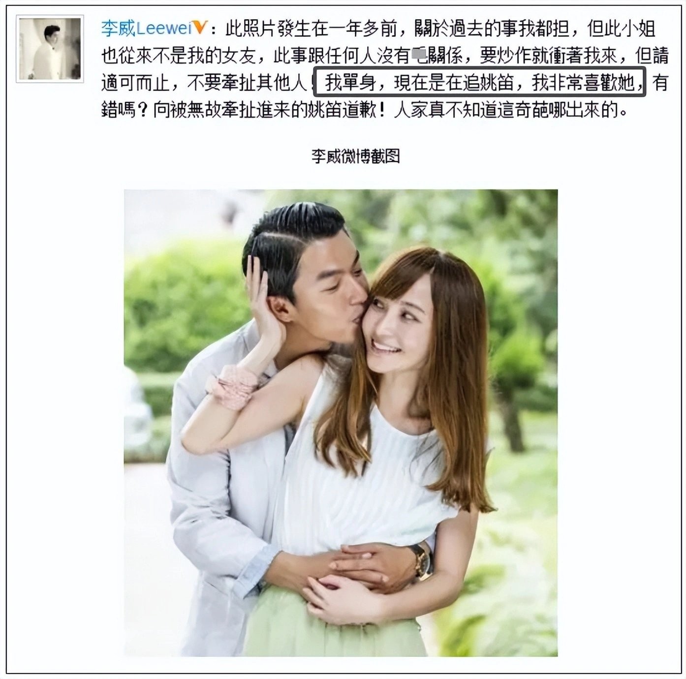 2015年李威发文承认正在追求姚笛,在当时引起了广泛热议,但最终这段感情无疾而终。