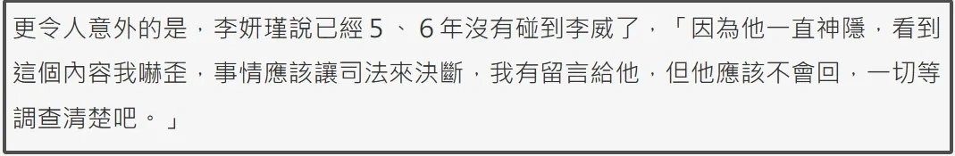随着舆论的不断发酵,李威对于此事并没有做出任何回应,反倒是他的堂弟李易透过经纪人回应称自己对于李威卷入命案一事不太清楚,并透露过往只有过年见面,平常都没有联络。