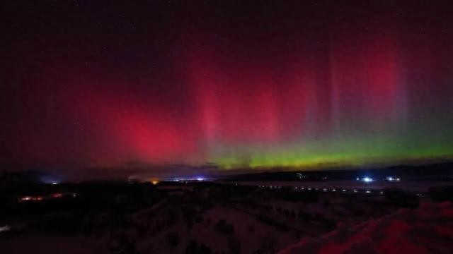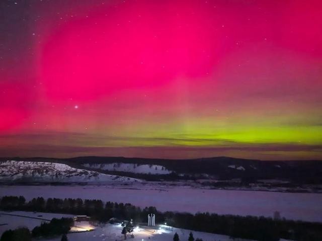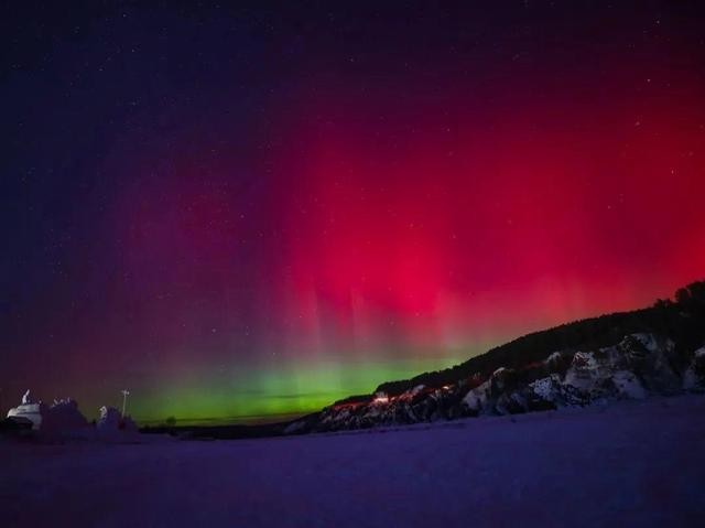 受地磁暴影响,黑龙江漠河出现绚丽的极光美景。在漠河北极村,通过肉眼可以看到绿色、红色、紫色的极光在夜空中交相舞动。此次的极光当中绿色光带占比更大,而且极光持续时间更长。