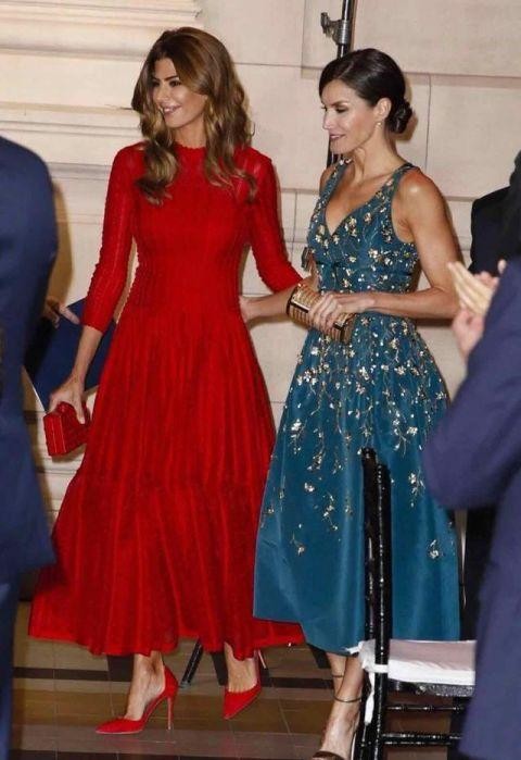 晚宴的造型更是美艳大方,整身的红色系,收腰红色大摆裙搭配红色手包和红色高跟鞋,在照片上都分外惹眼,更别说在现场了;莱蒂齐亚的V领蓝绿色刺绣复古裙搭配盘发,整个精致度提升超多,好身材完全的展现出来,两人美的不相上下。