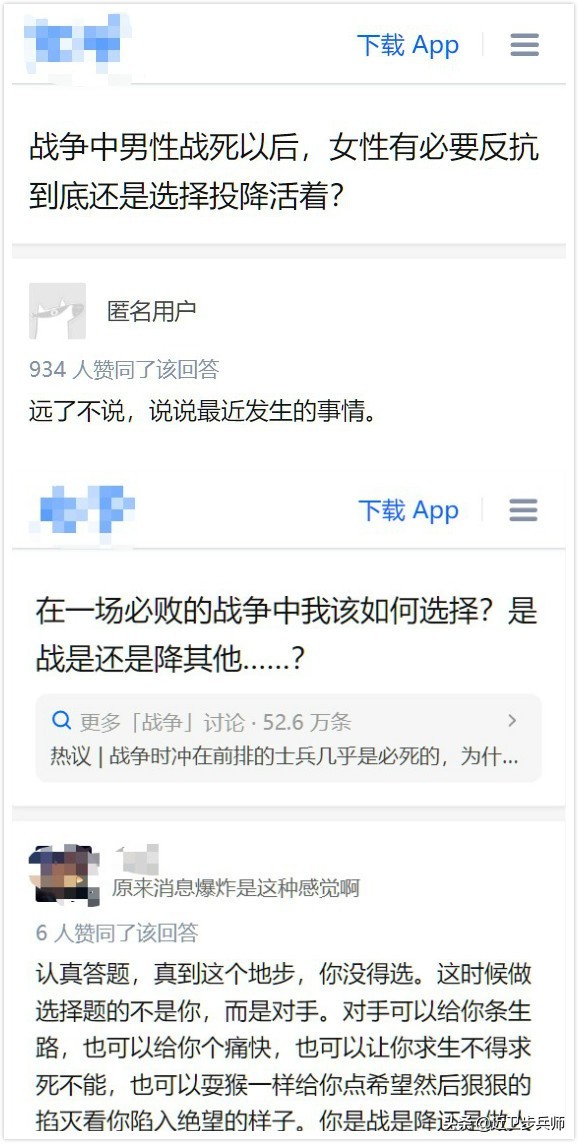 一个问题问的是战争必败是不是要投降,一个问题问的是男人都战死了女人要不要投降。