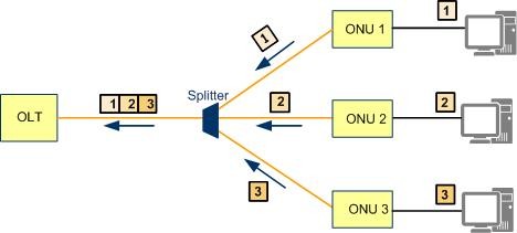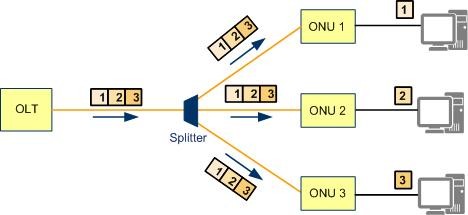 所有数据从OLT端广播到所有的ONU上,ONU再选择接收属于自身的数据,将其他数据直接丢弃。具体原理如所示。