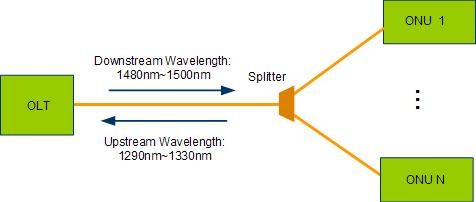 · GPON网络采用单根光纤将OLT、分光器和ONU连接起来,上下行采用不同的波长进行数据承载。上行采用1290nm~1330nm范围的波长,下行采用1480nm~1500nm范围的波长。