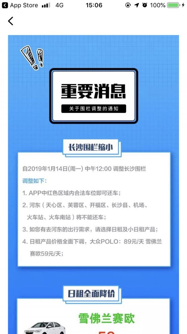 打开APP时,弹出来了带有三个界面的消息,其中两个是租车价格广告,另外一个则是名为“关于围栏调整”的“重要消息”,点进去后发现,此消息告知的是长沙围栏缩小的消息。
