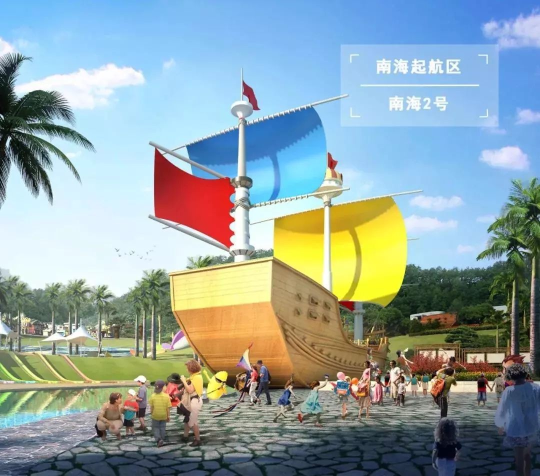 一走进景区大门,率先展现在我们面前的就是南海起航区。象征着“新启航、新希望”的帆船——南海2号正停靠在精灵湖上。建成后,甲板就会化身为舞台,为游客上演由异国风情舞蹈、跌宕起伏剧情以及神奇精灵魔法等元素组成的《南海2号show》。