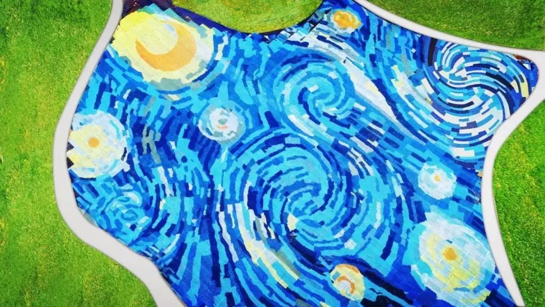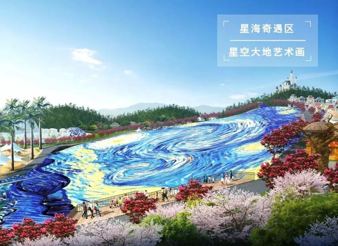 在星海奇遇区,由数百万张光盘依山铺设而成的20000㎡星空大地艺术画绝对让你震撼。这幅作品通过50多名绘画大师和60多名设计施工技师,耗时3个月,将数百万张废弃光盘重新组合,进行“环保+文化”的再创作,最终浪漫再现梵高的《星空》奇景。未来这里还将增设光盘DIY巴士与精灵热气球项目,让你的互动变得更加具有趣味性。