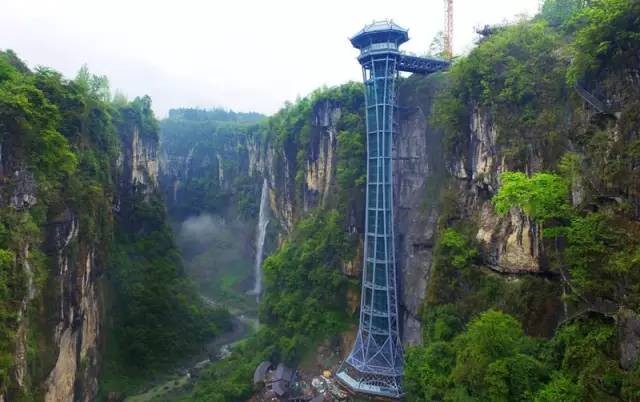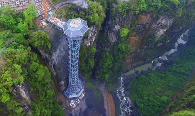 正在建设的恩施大峡谷云龙地缝观光电梯,外形酷似“小蛮腰”。,总投资约3500万元,观光电梯为纯钢结构,建筑高度130.1米,载重量为1600千克,运行速度2.5米/秒,单程运行时间为50秒。