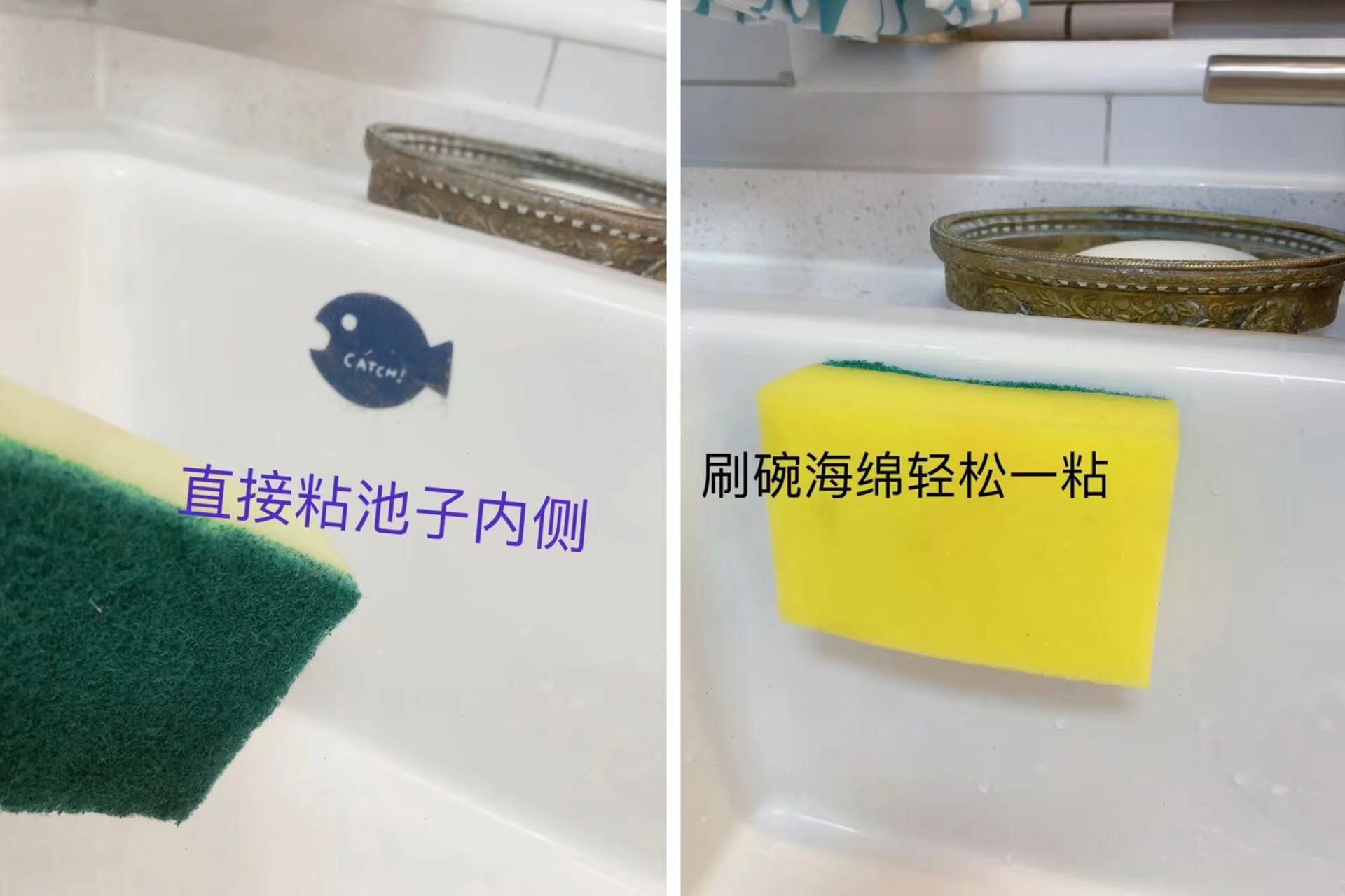 自带背胶,直接贴在水槽侧面,刷碗海绵直接可以在池子里沥水晾干,简单干净。