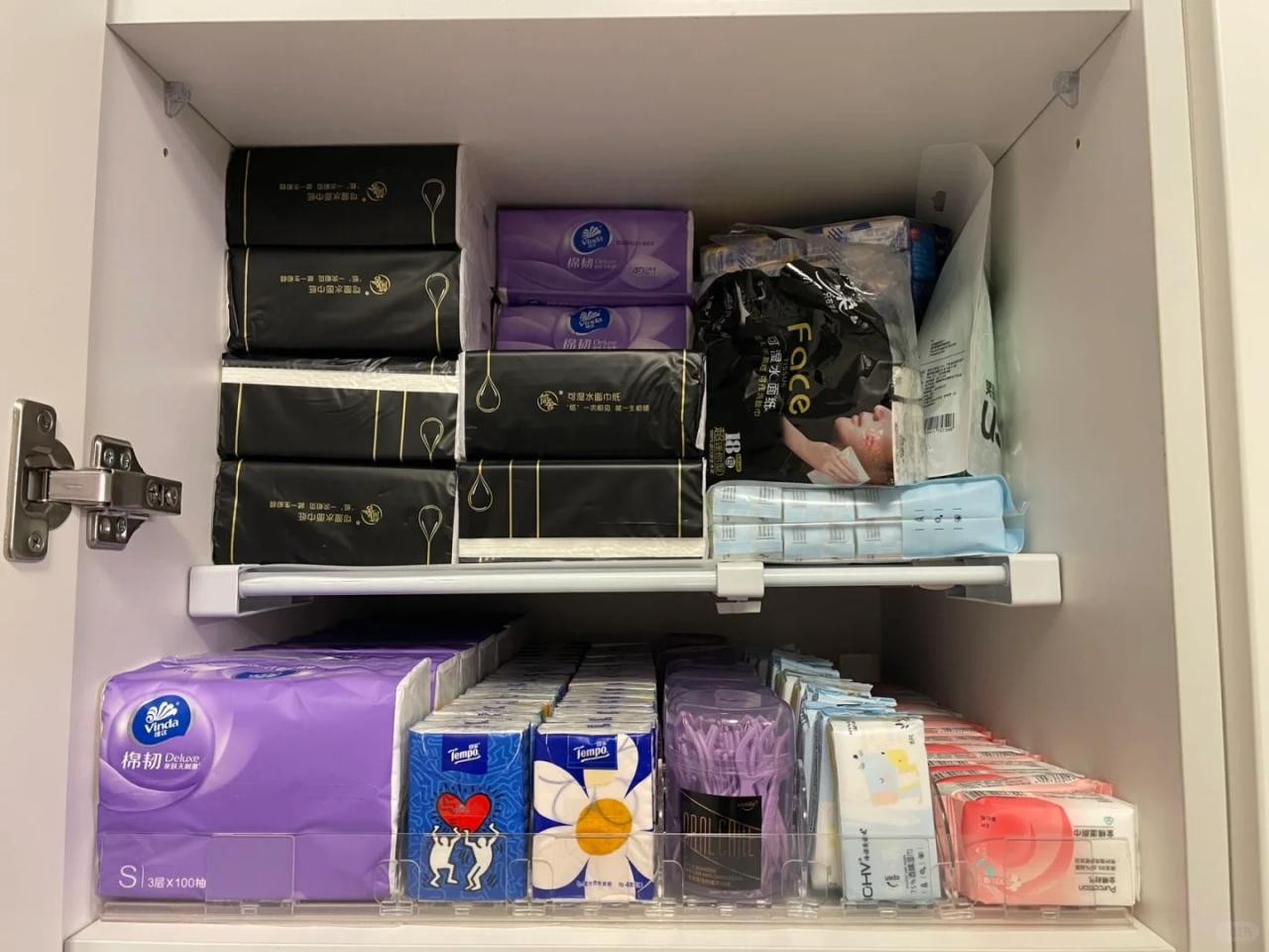 高柜收纳纸巾,一拿一推,高处深处的纸巾会自动补到前面,很方便,轻松拿到。