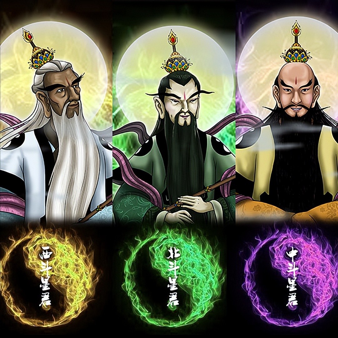 4. 北斗星君:即著名的北斗七星,主管北方,象征冬天与肃杀,与水行相关,道教中认为北斗星君主宰人的生死轮回、消灾解厄以及指引亡魂,有“北斗主死”的说法。