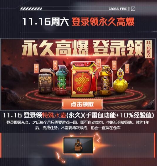 值得一提的是,本次活动获得的特殊水壶价值度极高,除了10%的经验值加成外,还有手雷包的加成效果,可以说获得这个完全不亏了,不过若想获得这个并不容易,与源计划系列武器的获得方式相同,需要每个月游戏一局完成续约,累计1年后才可以领取永久版。不得不说这个道具的领取难度还是比较大的,不过各位CFer要是每个月都玩的话就比较轻松了。