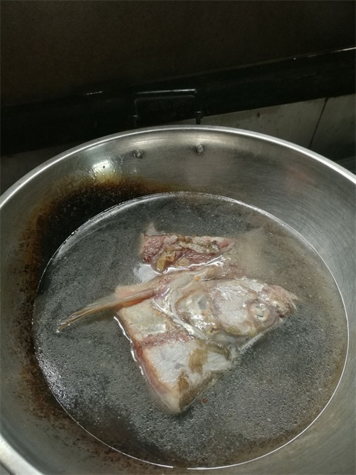 煎好后,放汤,为了防止粘锅,煎之前可用姜片将锅抹一下,同时保证鱼身的水分吸干