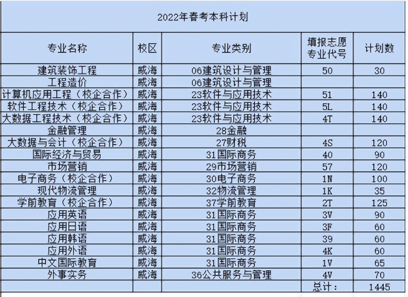 2022年山东外事职业大学春季高考在本科、专科批两个批次招生。本科批1445人,专科批715人,共计招生2160人。详细招生专业详见图表。