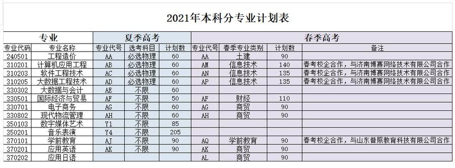 2021年山东外事职业大学学院春季高考在本科、专科批两个批次招生。本科批1060人,专科批300人,共计招生1360人。详细招生专业详见图表。