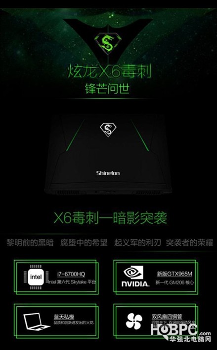 外观方面,炫龙X6毒刺打破笔记本中规中矩的构造,两条幽绿的亮光在黑夜里尤其炫酷,给人一种神秘的感觉,同时强劲的性能表现满足游戏玩家的需求,搭配英特尔第六代skylake i7-6700处理器,相较于前几代处理器,第六代处理器性能提升更大,运行更快,完美支持运行各大型游戏,配备GTX 965M游戏级独显,性能直追GTX970M游戏级独显,计算处理能力自然不在话下,能够畅玩市面上大多数的大型游戏,类似GTA5、孤岛危机、使命召唤等被称之为显卡危机的游戏,都能中高特效运行。