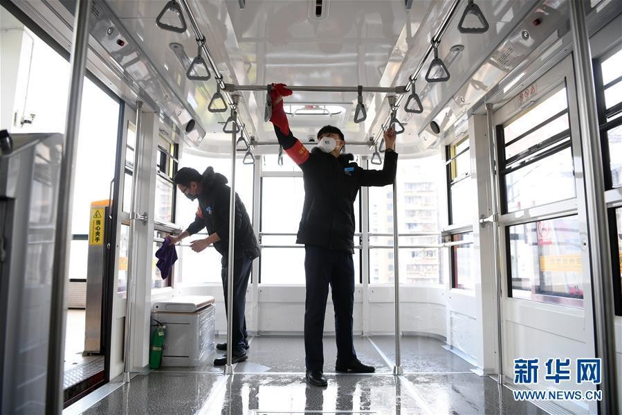 3月18日,工作人员为重庆长江索道轿箱消毒。 当日,重庆索道公司发布消息称,3月18日起,长江索道恢复运行,每日运行时间暂定为7:30-19:00,后期将根据疫情、客流变化适时调整。 新华社记者 唐奕 摄