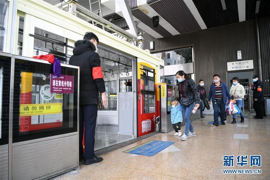 3月18日,市民游客排队搭乘长江索道。 当日,重庆索道公司发布消息称,3月18日起,长江索道恢复运行,每日运行时间暂定为7:30-19:00,后期将根据疫情、客流变化适时调整。 新华社记者 唐奕 摄