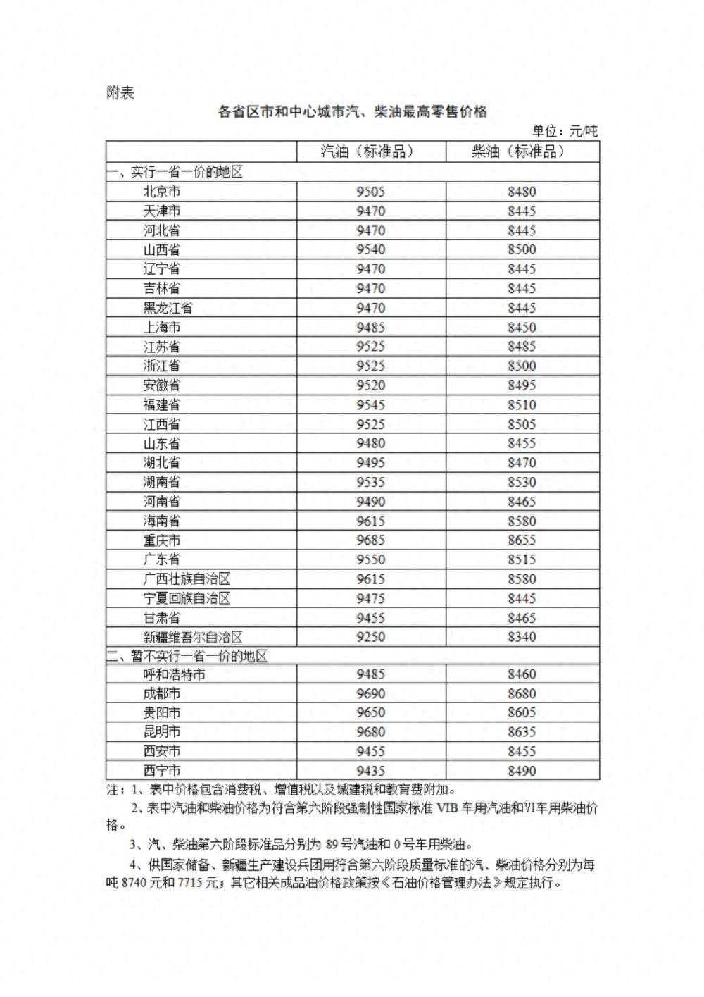 根据近期国际市场油价变化情况,按照现行成品油价格形成机制,自2025年2月19日24时起,国内汽、柴油价格(标准品,下同)每吨分别降低170元和160元。调整后,各省(区、市)和中心城市汽、柴油最高零售价格见附表。