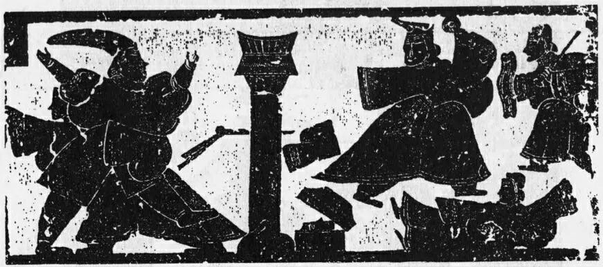 荆轲带着樊於期首级和燕国督亢地图前往秦国。在咸阳宫,荆轲向秦王献上地图,图穷匕见时,他持匕首刺向秦王,,被夏无且(jū)的药囊击中,最终行刺失败,被秦王拔剑击成重伤后为秦侍卫斩杀。