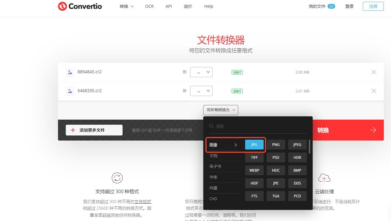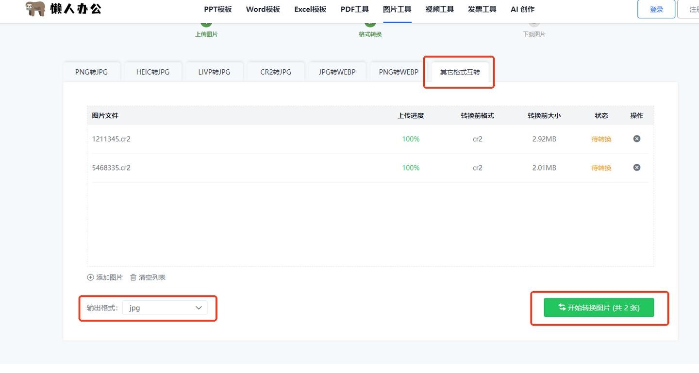 点击【其他格式互转】,上传需要转换的多个cr2图片,然后设置【输出格式】为JPG,点击【开始转换图片】即可。