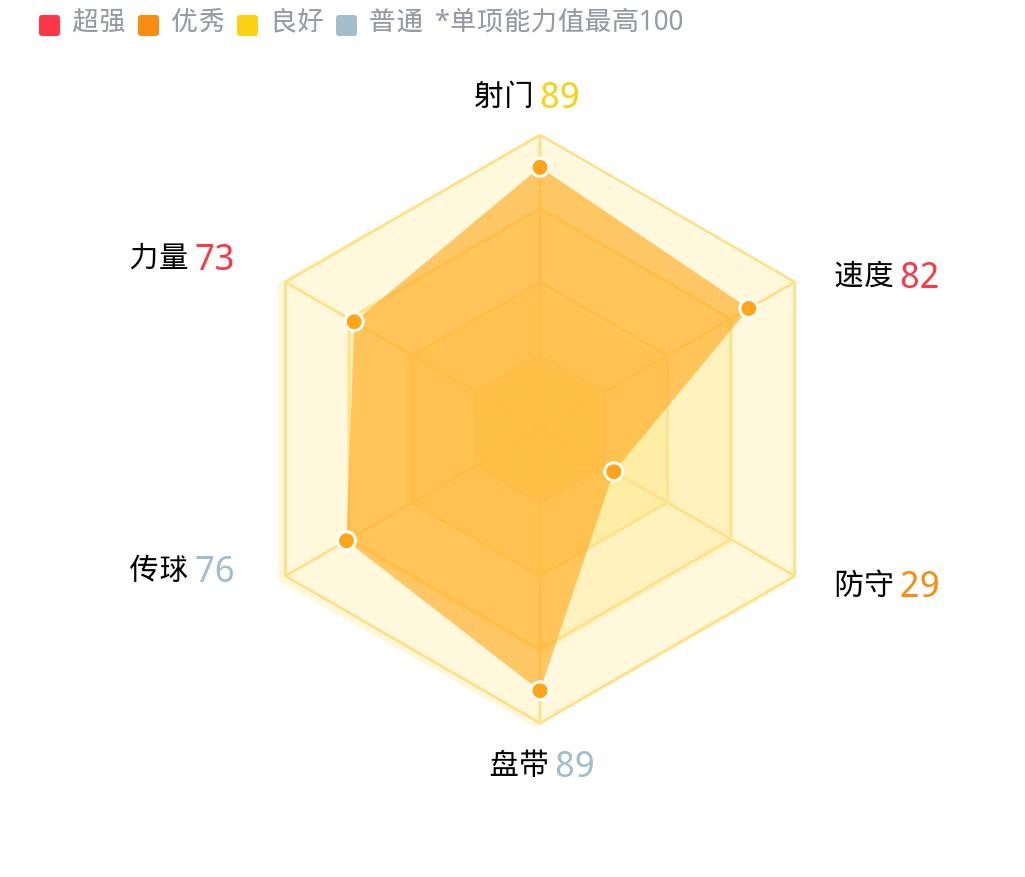 参考阿奎罗的综合能力值,射门89分,阿奎罗是一名终结能力极强的前锋,他的射门非常出色,在禁区内能够把握机会;速度82分,阿奎罗有着极强的爆发力,可以快速的前插和过人;盘带89分,阿奎罗有着极强的控球能力,脚下技术出众;传球76分,阿奎罗传球出色,可以给队友送上助攻,力量73分,阿奎罗身体素质很强,敢于和后卫去对抗;防守29分,阿奎罗在场上的作用主要是进攻,他不需要参与过多的防守。