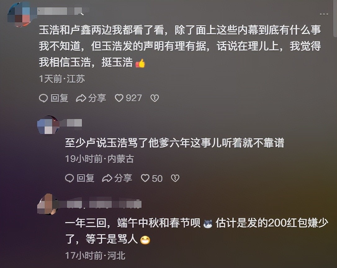 老实的玉浩也是用一则视频说明了自己的看法,比起卢鑫煽动粉丝辱骂的行为,显然真诚的人更为打动人。