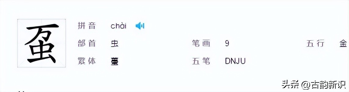 从上图中我们可以看到,“虿”字的汉语拼音读作【chài】,读第四声,音同“”。上下结构,部首是“虫”,总笔画是9笔。它是我们通用规范汉语二级汉字。