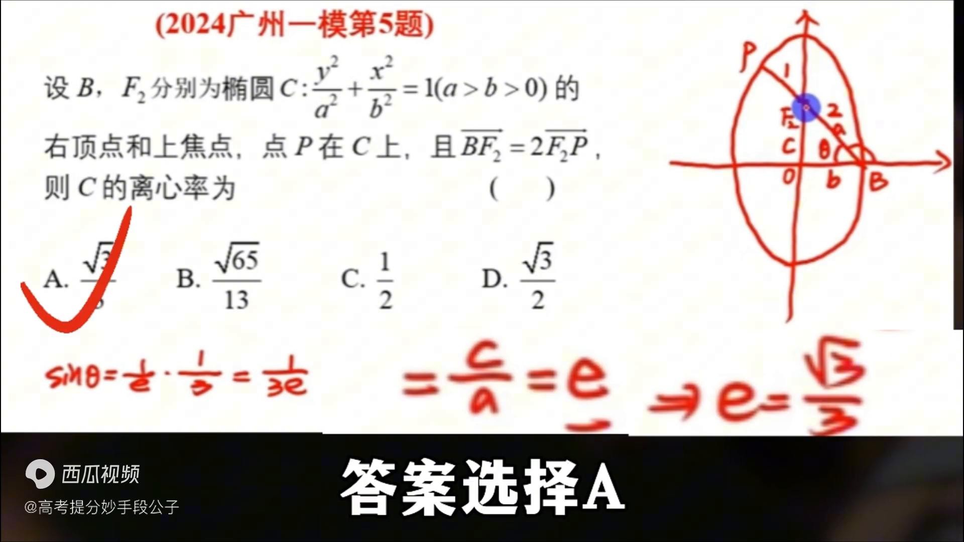 直接来看一道题。首先画出图形,注意这是一个纵椭圆,焦点在y轴,通过观察条件发现这就是焦比弦,通过关系可以得到2:1。题目要求离心率,设直线的倾斜角为c塔,进一步分析发现选锐角就可以了。这时候焦点在y轴,sinC塔等于E分之1,比例相加分之比例相减等于3E分之1。