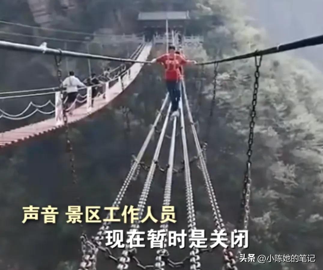 从视频中看出,网红桥是使用钢绳索来搭建的桥梁,大概离地有几十米的高度,上面的游客均是绑着安全带踩着踏板一步一步向前迈进。