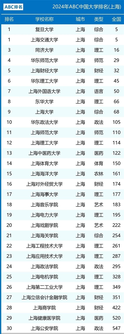 2024年上海市30所大学排名:复旦与上海交大并列第1,上海大学第9