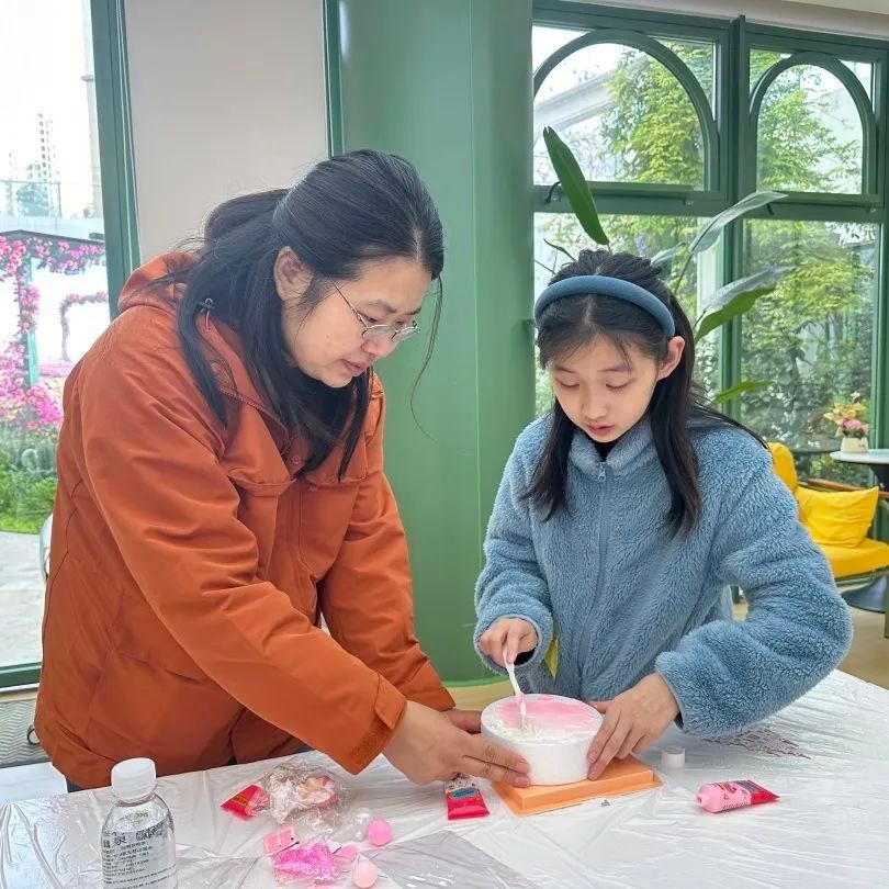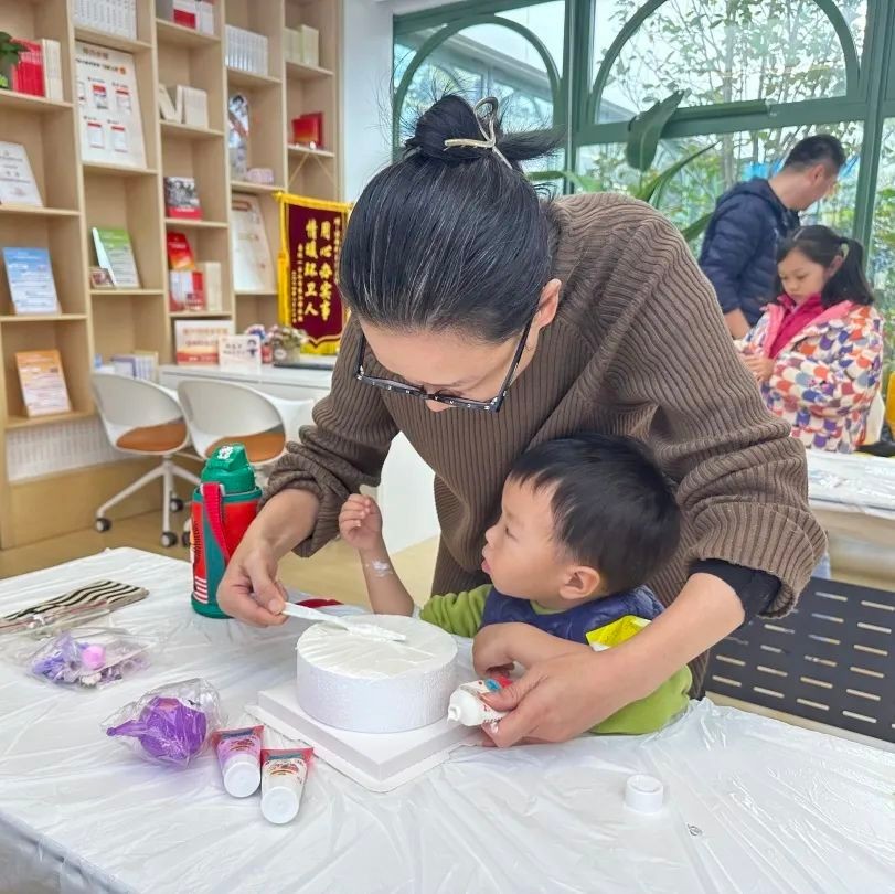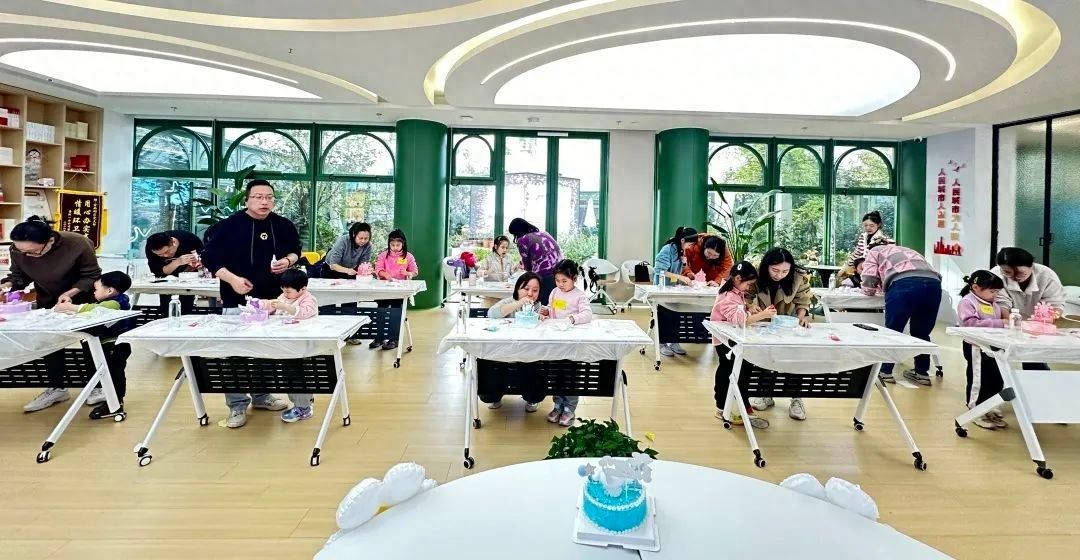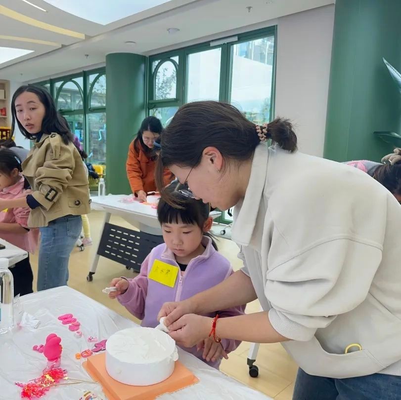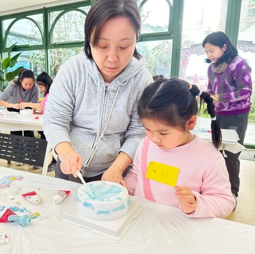 “比赛开始!”随着比赛的号令响起,亲子家庭们迅速投入到创作中,他们分工明确,配合默契。孩子们发挥着天马行空的想象力,用奶油胶在蛋糕上描绘出各种可爱的卡通图案,家长们则在一旁耐心协助,帮忙挤奶油、摆放装饰品,现场气氛十分热烈。
