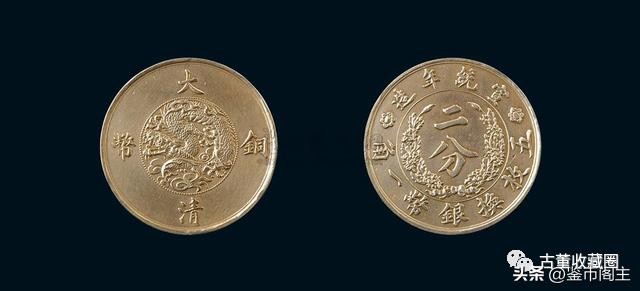 这种古币的特点就是背面是龙纹,跟大部分的铜币一样没有什么特别的,正面钱文为“大清铜币 户部 丙午 当制钱二文”大清铜币中间为“川”,材质是红铜材质,一般品相的市场价格都在150万左右;