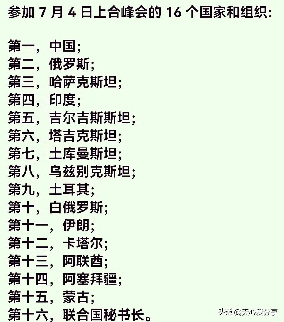 参加 7 月 4 日上合峰会的 16 个国家和组织: