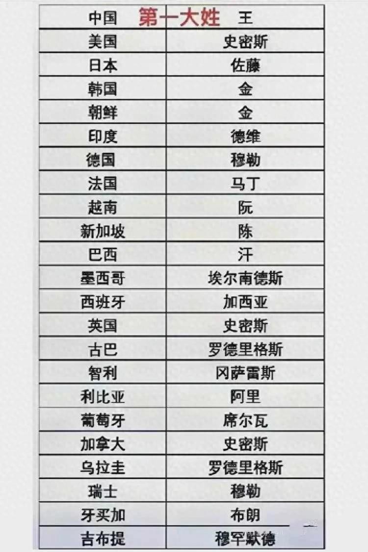 除了中国、美国和日本,其他国家也有各自的第一大姓。例如,印度的第一大姓是德维,德国的第一大姓是穆勒,俄罗斯的第一大姓是伊万诺夫等等。不同国家的第一大姓反映了各自国家的历史、文化和人口分布。