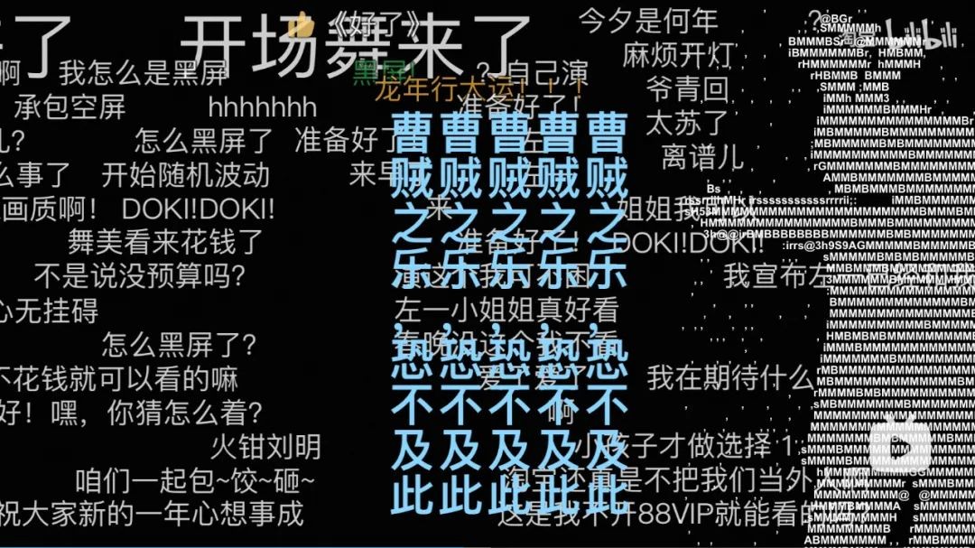 B站版春晚从5分59秒开始,到10分56秒,有将近长达5分钟的黑幕时间,不少网友把黑幕当成了背景板,以弹幕的形式成为了2024淘宝春晚的“云演员”。