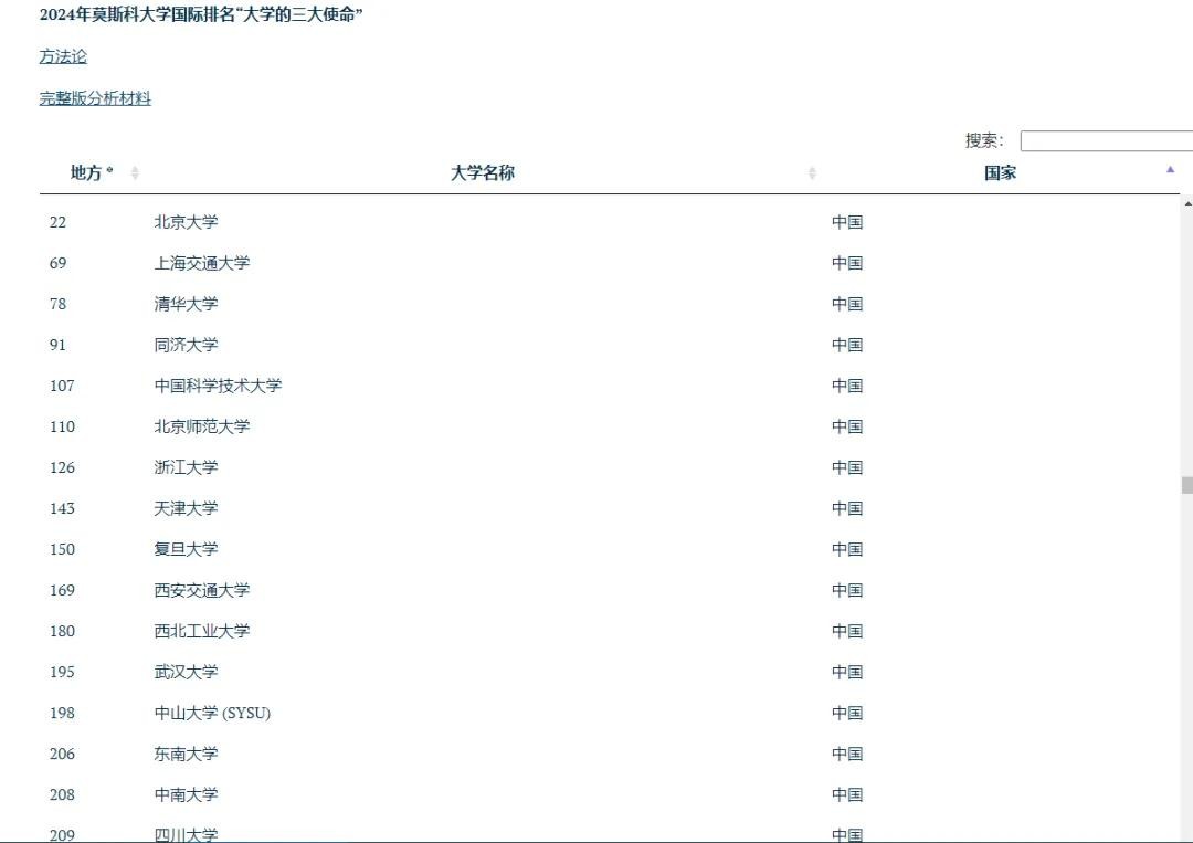 北京大学(全球第22名)香港中文大学(全球第30名)上海交通大学(全球第69名)清华大学(全球第78名)香港大学(全球第90名)同济大学(全球第91名)香港理工大学(全球第95名)中国科学技术大学(全球第107名)北京师范大学(全球第110名)浙江大学(全球第126名)