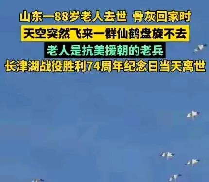 山东一位88岁的抗美援朝老兵,在12月24日长津湖之战纪念日离世,26日火化后,骨灰回家时,天空突然飞来一群仙鹤盘旋不去……,有网友说,也许是老英雄的战友来接他了……