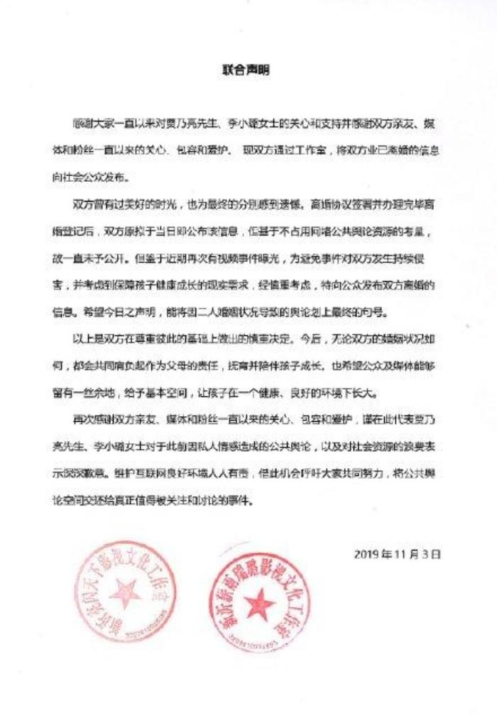 我们且来看工作室发表的离婚声明,请注意落款日期是:2019年11月3号。