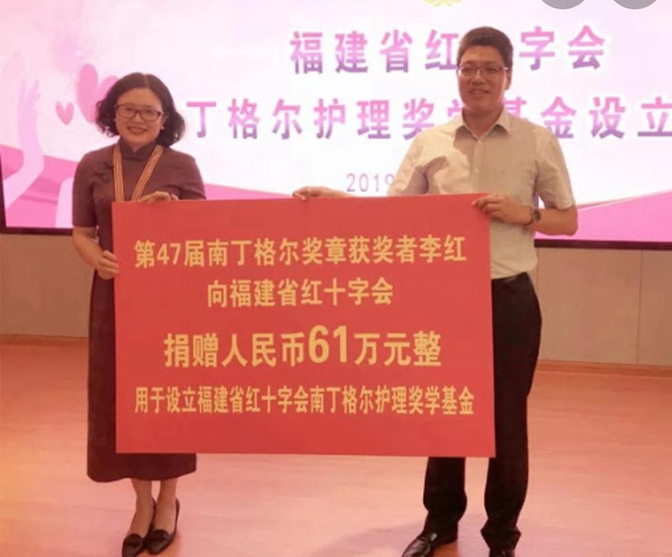 李红获奖后将全部奖金共计61万元人民币悉数捐出,倡议发起成立了福建省红十字会南丁格尔护理奖学基金。