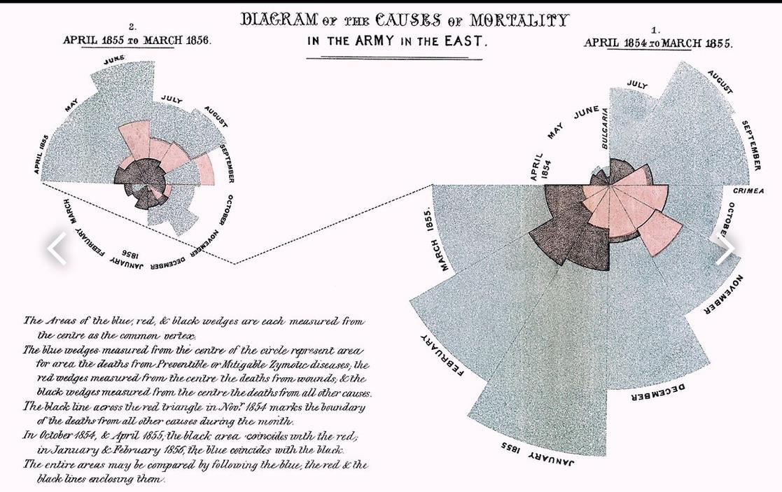 南丁格尔首开用圆饼玫瑰图分割标注数据统计的先河,1859年她成为英国皇家统计学会的第一个女会员,也是历史上第一个女统计学家。