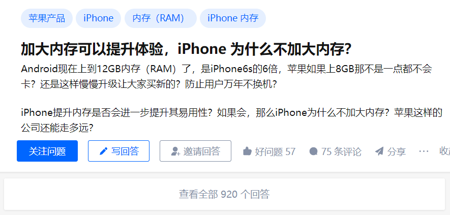 事情的起因是这样的,最近托尼闲来无事逛知乎的时候,偶然刷到这样一个很有意思的问题:加大内存可以提升体验,iPhone 为什么不加大内存?