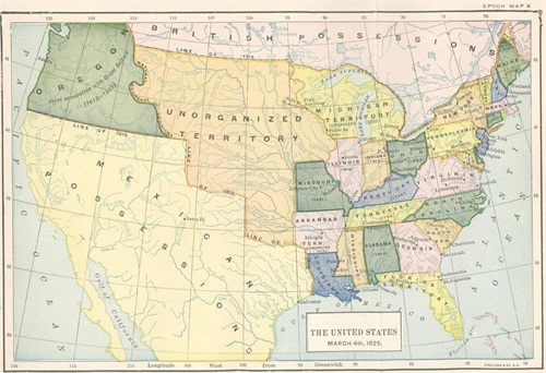 1825年的美国。西南部还属于墨西哥,西北部未开发