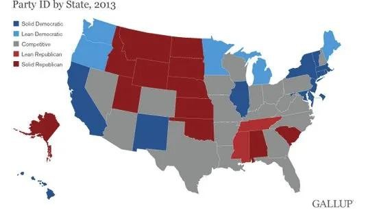 2013年每周倾向于支持哪个党。红色的是共和党,蓝色的是民主党,灰色的是没有明显偏向(因此两档竞争比较强)