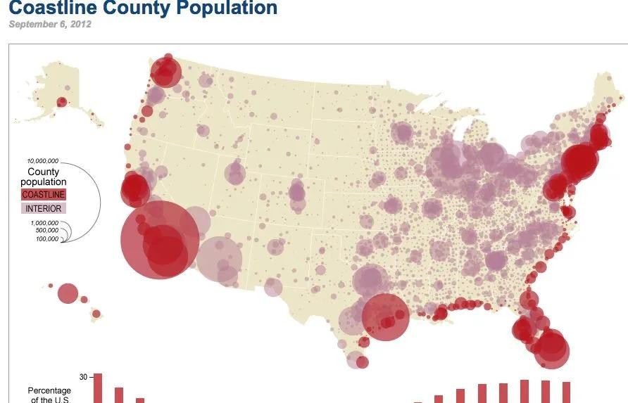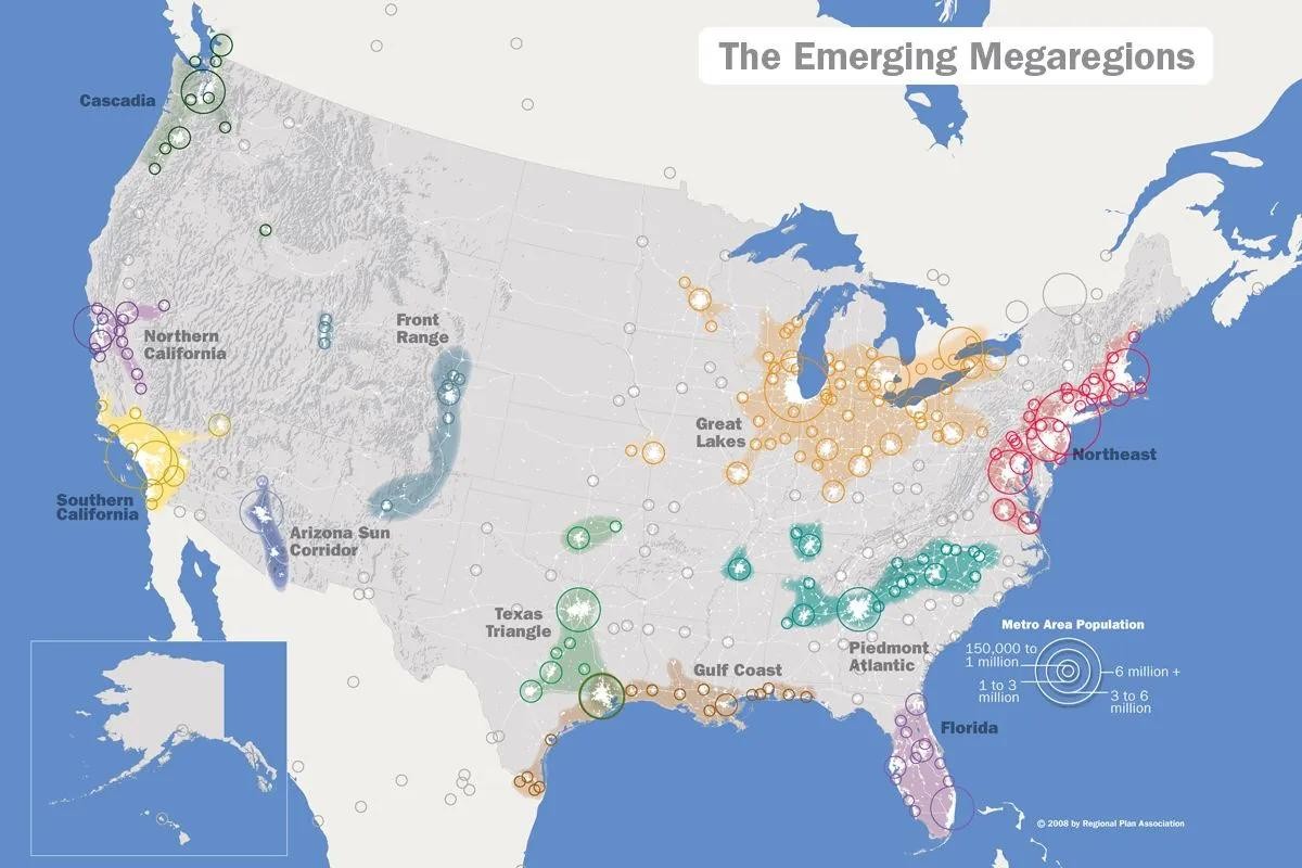美国各县楼市价值示意图。面积不是实际面积,而是按照楼市价值。因此,组大的是房子最贵的湾区都市区、洛杉矶都市区、和纽约都市区