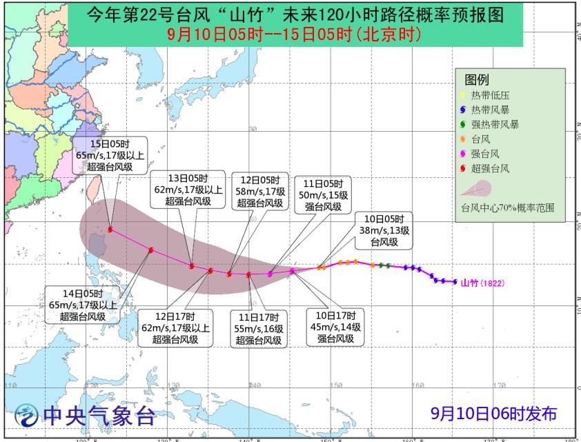 我们先来看看第22号台风山竹最新路径:今天(9月10日)凌晨5点,于7日20点在西北太平洋洋面上生成的今年第22号台风山竹位于距离美国关岛东偏北方向约430公里(北纬14.6度、东经148.6度);强度等级为台风级;最大风力达13级,38米/秒(约137公里/小时);中心气压965 hPa。