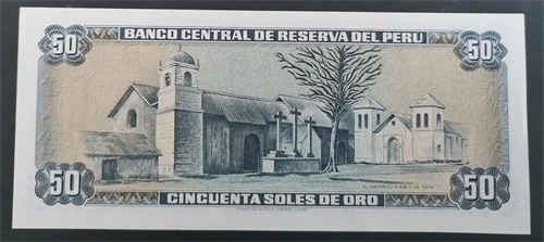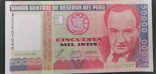正面图案为维克托·劳尔·阿亚·德拉托雷Víctor Raúl Haya de la Torre (1895-1979),秘鲁政治领袖,曾任秘鲁总统。出生于秘鲁北部城市特鲁希略。1913年考入特鲁希略国立大学,学习文学。在大学时期结识了秘鲁诗人塞萨尔·巴列霍(César Vallejo)。后就读于利马的圣马科斯国立大学。思想进步,对当下时事多有不满,致力于改革,并成立了Universidades Populares Gonzalez Prada组织,为之后组建人民党奠定了基础。1923年,他因对政府提出不当的言论,被奥古斯托·莱基亚·萨尔塞多政府流放,1924年5月7日在墨西哥城组建了秘鲁人民党。1931年,他回到秘鲁竞选总统。同年遭到15个月的判刑,他的政党被强行解散。1945年,他推举布斯塔曼特·伊·里韦罗为总统候选人,参加竞选获胜。然而在1948年10月部分党员在卡亚俄策动海军起义失败,人民党再次遭到解散,重新转入地下。同年11月,曼努埃尔·阿图罗·奥德里亚·阿莫雷蒂政变后,他前往利马的哥伦比亚大使馆寻求庇护,之后流亡哥伦比亚,直到1954年回国。他的政党于1956年才恢复合法地位。1962年他宣布竞选总统,获得了微弱的胜利。但是军政府重新在1963年举行选举,他在竞选中落败。1979年在他临终前,参加了制宪会议,签署了秘鲁新宪法。