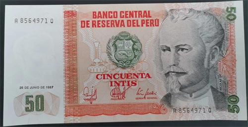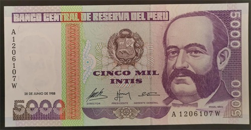 正面图案为秘鲁海军上将Miguel Grau,他在太平洋战争中以一己之力跟智利海军耗了大半年,最后牺牲在智利,是秘鲁人民心目中最伟大的民族英雄,2000年他被评为“El peruano del milenio(一千年来最伟大的秘鲁人)”