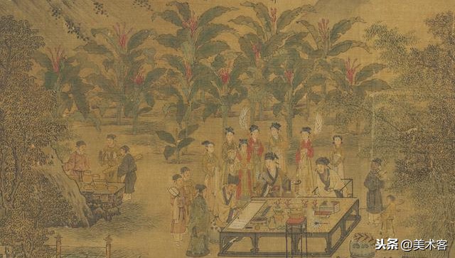 宋代刘松年《西园雅集图》,主要绘制了宋代雅士高僧苏轼、黄庭坚、米芾、圆通大师等盛会于王诜西园。